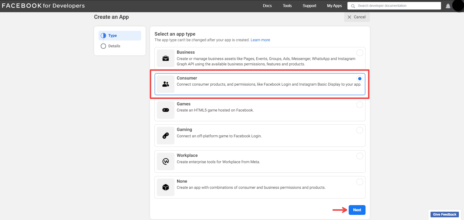 This is where you can select an app type. Choose the "Consumer" type. Once selected, click the button.